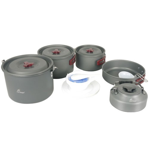 适合6-7人使用,包括一煎锅、大锅、中锅、小锅、茶壶、汤勺、饭勺、百洁布及三只碟盘和六只碗。采用进口铝材,高硬度阳极氧化处理,耐刮擦,易清洗。塑碗、汤勺采用PP材料;饭勺、碟盘采用密胺材质,高硬度,耐高温。黑色网袋及纸盒包装。