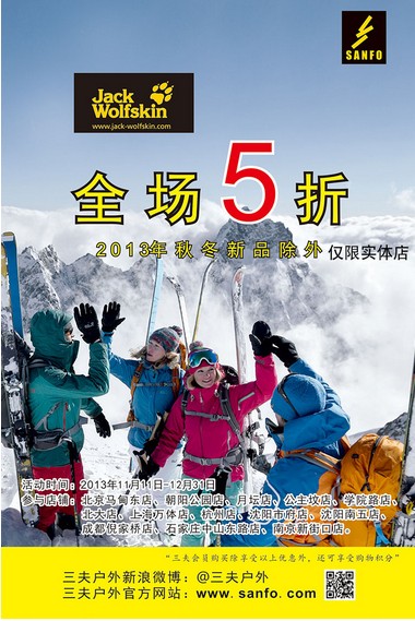 Sanfo Outdoors -- The leading specialty outdoor retailer in China, it has more than 30+ high-level outdoor stores in Beijing, Shanghai, Nanjing, Hangzhou, Chengdu, Shenzhen, Shenyang, Changchun, Qingdao, Shijiazhuang, Suzhou, Wuxi etc. Please visit www.sanfo.com for more information.