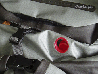 | 原来是个水袋管出口兼单向排气阀门,因为是全防水袋设计,如果没有这个出气口,在装包时会造成打包压缩困难的现象,轻轻一按,问题就解决了,但有点遗憾的是,由于阀门开口向内且没有锁死装置,很怀疑外部水压过大时这个阀门的密封性,试图拿这个包当救生圈玩泅渡的同学要当心鸟~~~~或者哪位舍身一试~~ |