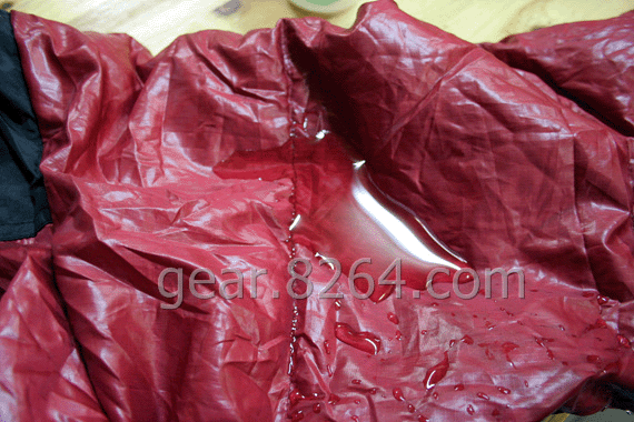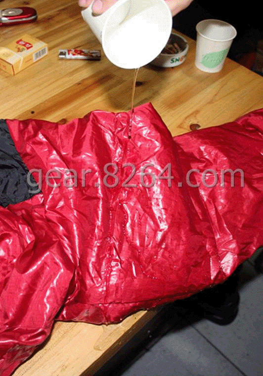 防泼水测试2: 用羽绒服兜主少量水,使水处在面料和缝线处。时间30秒 |