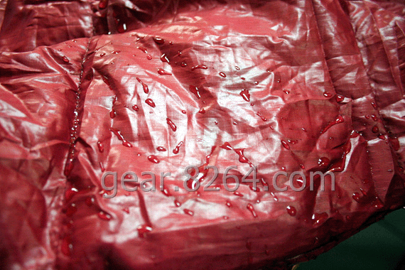 测试中发现,防泼水性能非常好,短时间测试的部分都没有水渗透现象,不过测试完成后发现一直浸泡在水中(从第一次泼水实验开始,大约有20分钟)的羽绒服背面面料已经浸水。用手捻羽绒,未发现羽绒粘连情况。 |