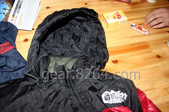 帽子藏在衣领中,没有充绒的两片面料。肩部采用了更耐磨的材料。 |